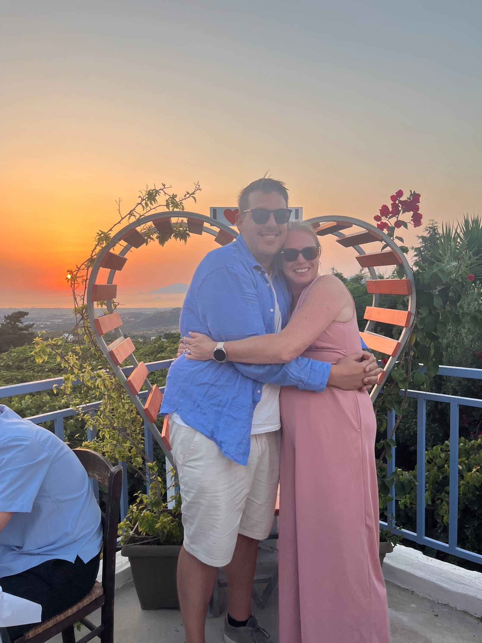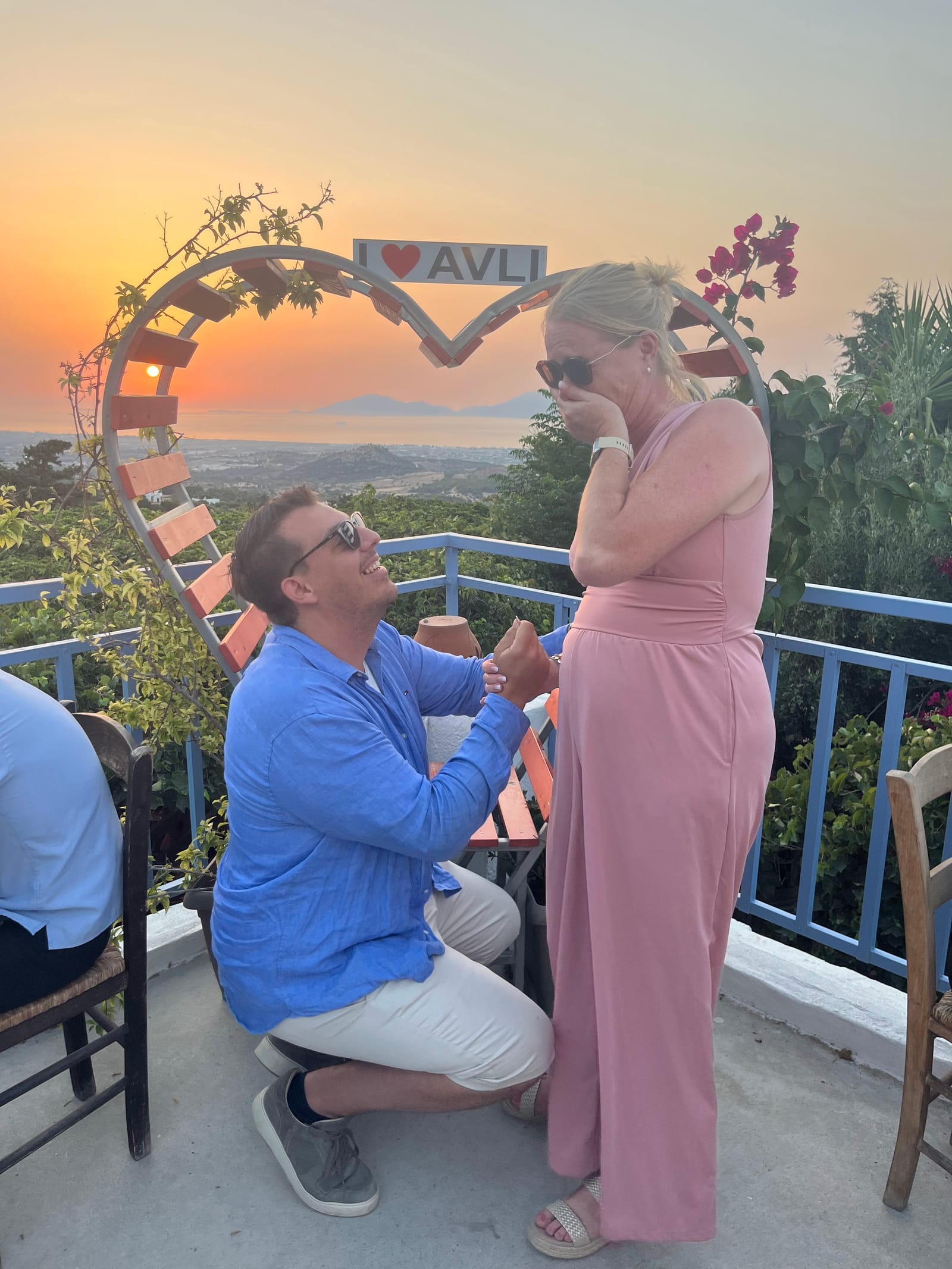 Na een prachtige rit met stoppunten op prachtige plekjes kwamen we in Zia aan, een bergdorpje dat bekend staat om zijn zonsondergang. Het eten was helaas niet echt een succes door een wespenplaag. We hebben ons eten naar binnen gewerkt en wilde vluchten maar Carmen wilde nog een foto maken op het dakterras. Bingo dacht Karim of zoals hij met de meiden had afgesproken, DONUT. Het startsein voor de meiden om hun camera en video klaar te maken. Carmen had nog niets door maar toen Karim op zijn knieën ging kon ze alleen nog maar JA zeggen.